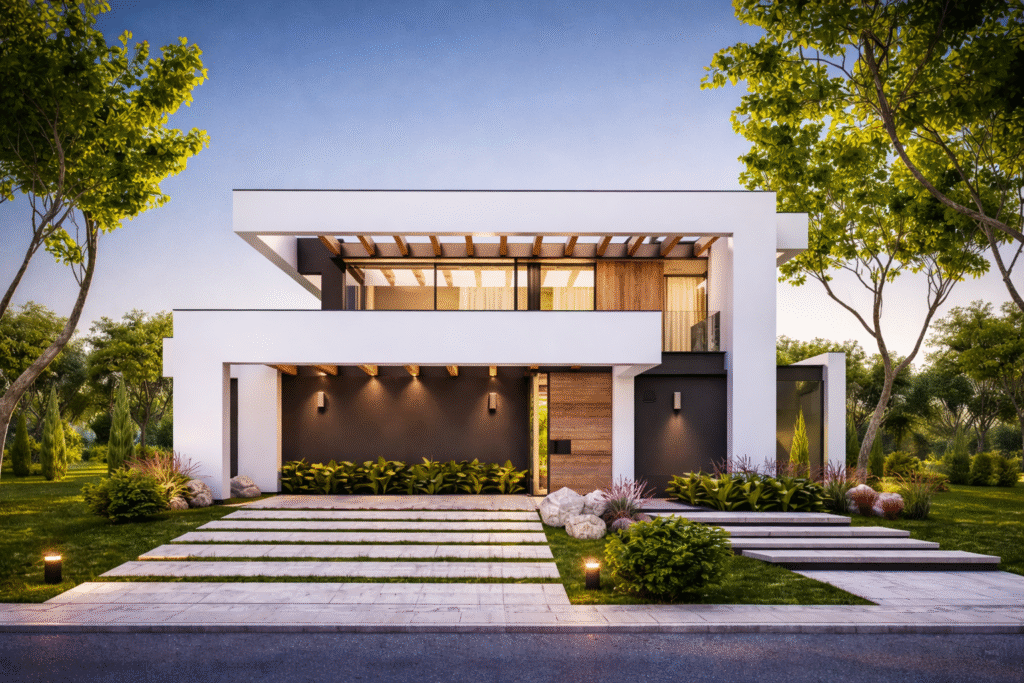 Inclui planta baixa, planta de cobertura, fachadas renderizadas, elevações, cortes, tabelas de esquadrias, áreas e portas, além do detalhamento dos materiais usados - tudo pronto para visualização e execução da obra.